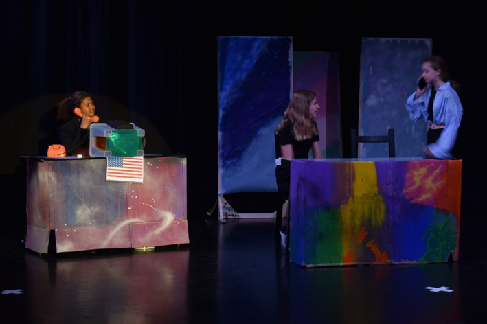 Weil die Schule in ihrem Fach „Projekt“ epochal arbeitet, hat die TUSCH- Gruppe erst im Februar angefangen mit der Entwicklung ihres Stückes; lediglich den START Workshop haben sie im Herbst 2025 gemacht, um einen Vorgeschmack auf Theater zu bekommen. 22 Schüler*innen der 7. Klasse, zum großen Teil ohne Erfahrung im Theater, haben erst einmal Übungen aus dem Bereich des Darstellenden Spiels gemacht, um ihrer Kreativität freien Lauf zu geben. Dann ging es in die Planungsphase. Anhand von selbst ausgewählten Texten, vor allem Liedtexten, haben sie in kleinen Gruppen Szenen ausgedacht. In Laufe der Wochen wurden diese Szenen erweitert und solange umgestellt, bis alle damit zufrieden waren. Das Üben der Szenen hat großen Spaß gemacht.